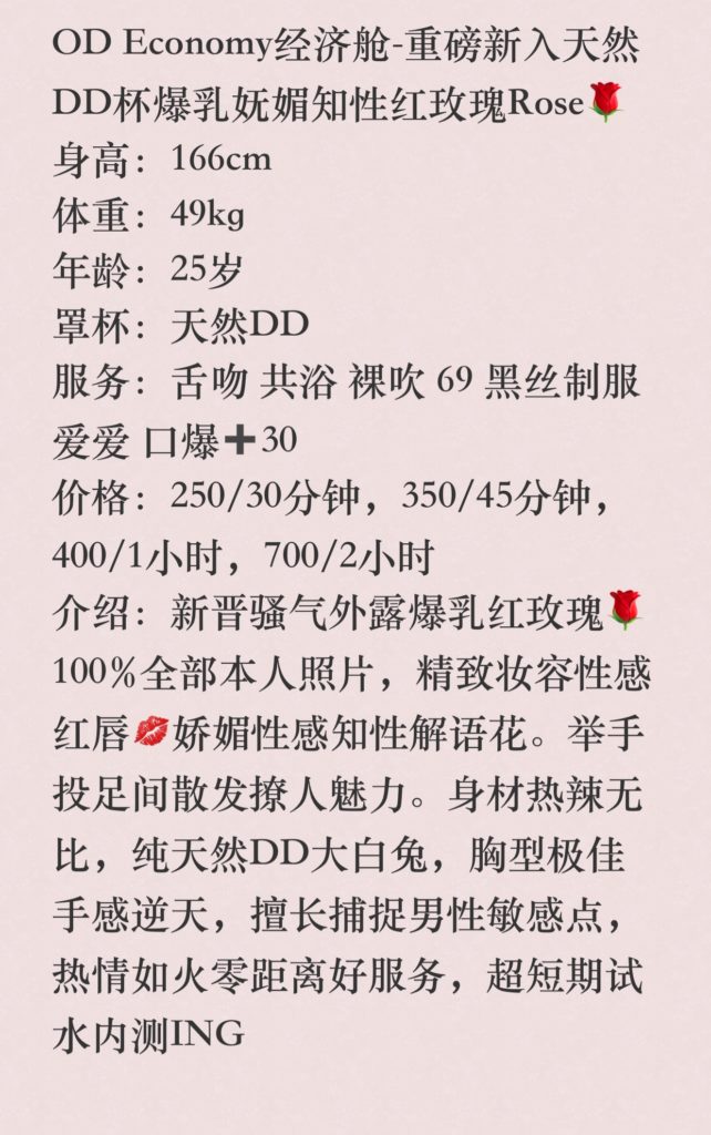 介绍:新晋骚气外露爆乳红玫瑰 100%全部本人照片,精致妆容性感红唇 娇媚性感知性解语花。举手投足间散发撩人魅力。身材热辣无比,纯天然DD大白兔,胸型极佳手感逆天,擅长捕捉男性敏感点,热情如火零距离好服务,超短期试水内测ING